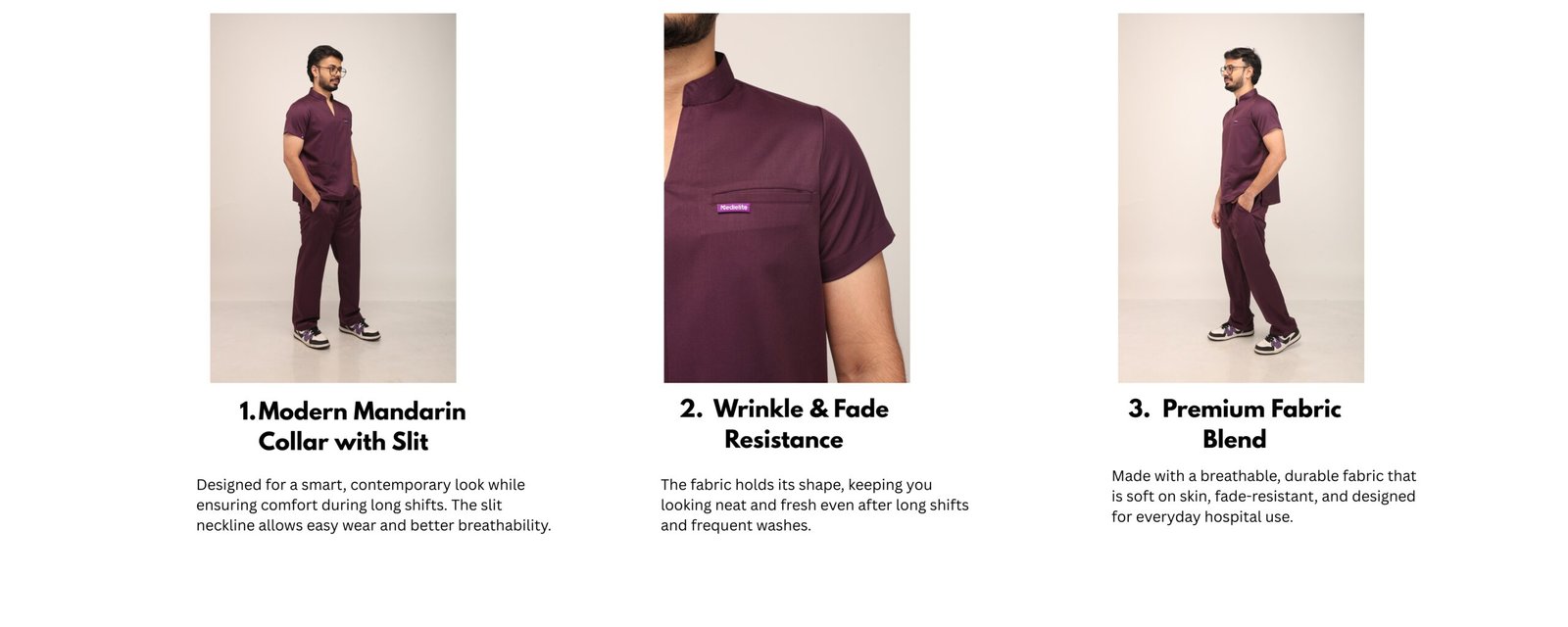 This scrub set brings style and comfort to the workplace for modern medical professionals. Designed with a chic mandarin collar and subtle slit, short sleeves for easy movement, and five practical pockets for everyday essentials, it combines functionality with a polished look—proving that doctors can be stylish at work too.