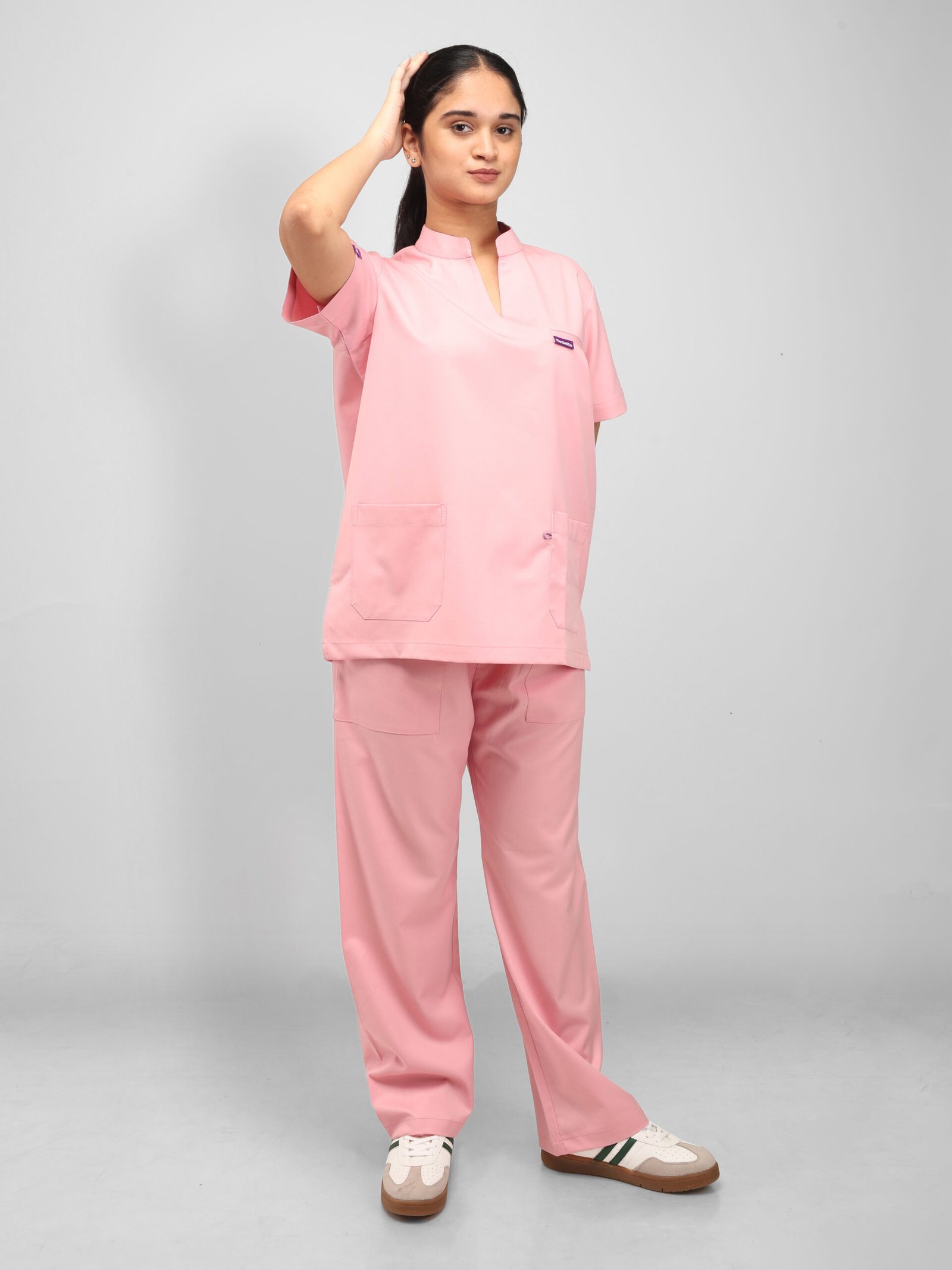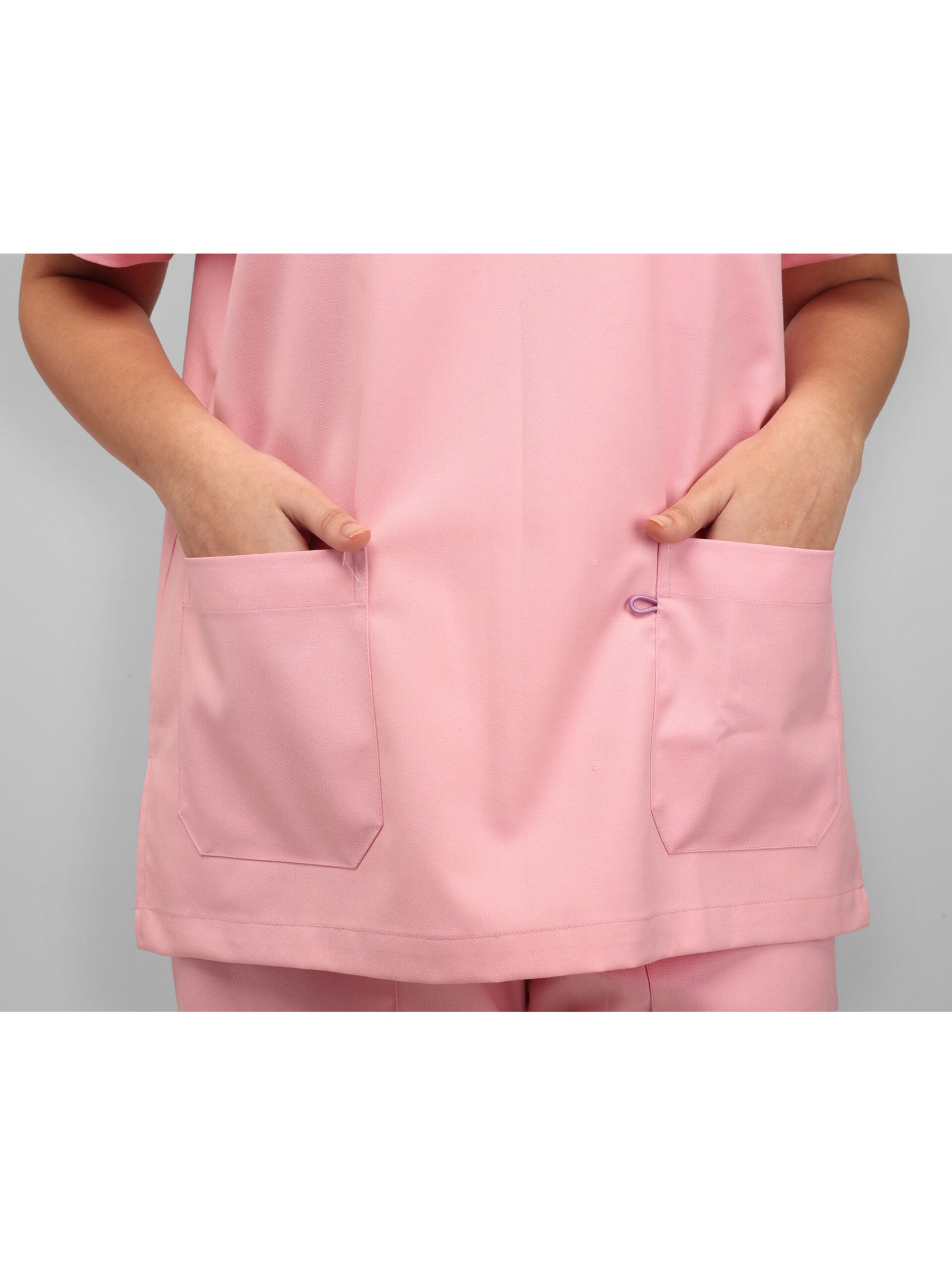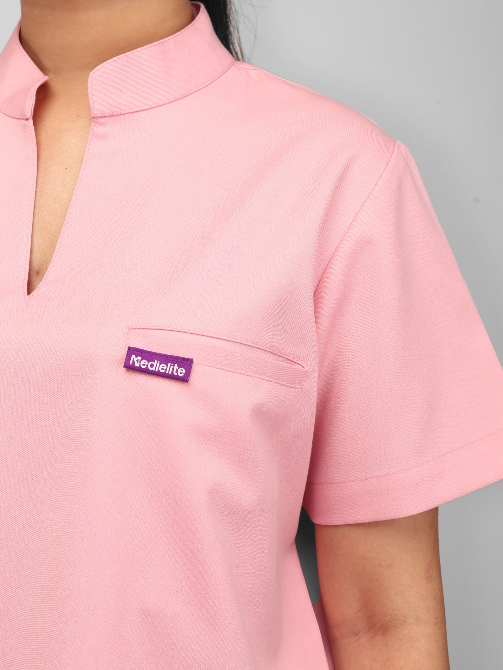This pink scrub set brings style and comfort to the workplace for modern medical professionals. Designed with a chic mandarin collar and subtle slit, short sleeves for easy movement, and five practical pockets for everyday essentials, it combines functionality with a polished look—proving that doctors can be stylish at work too.