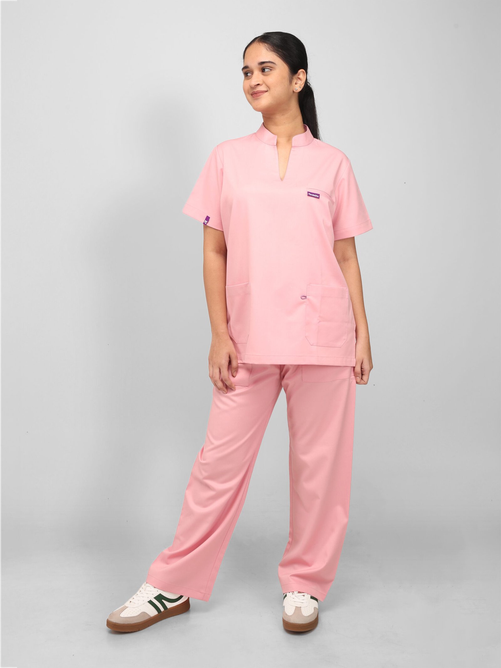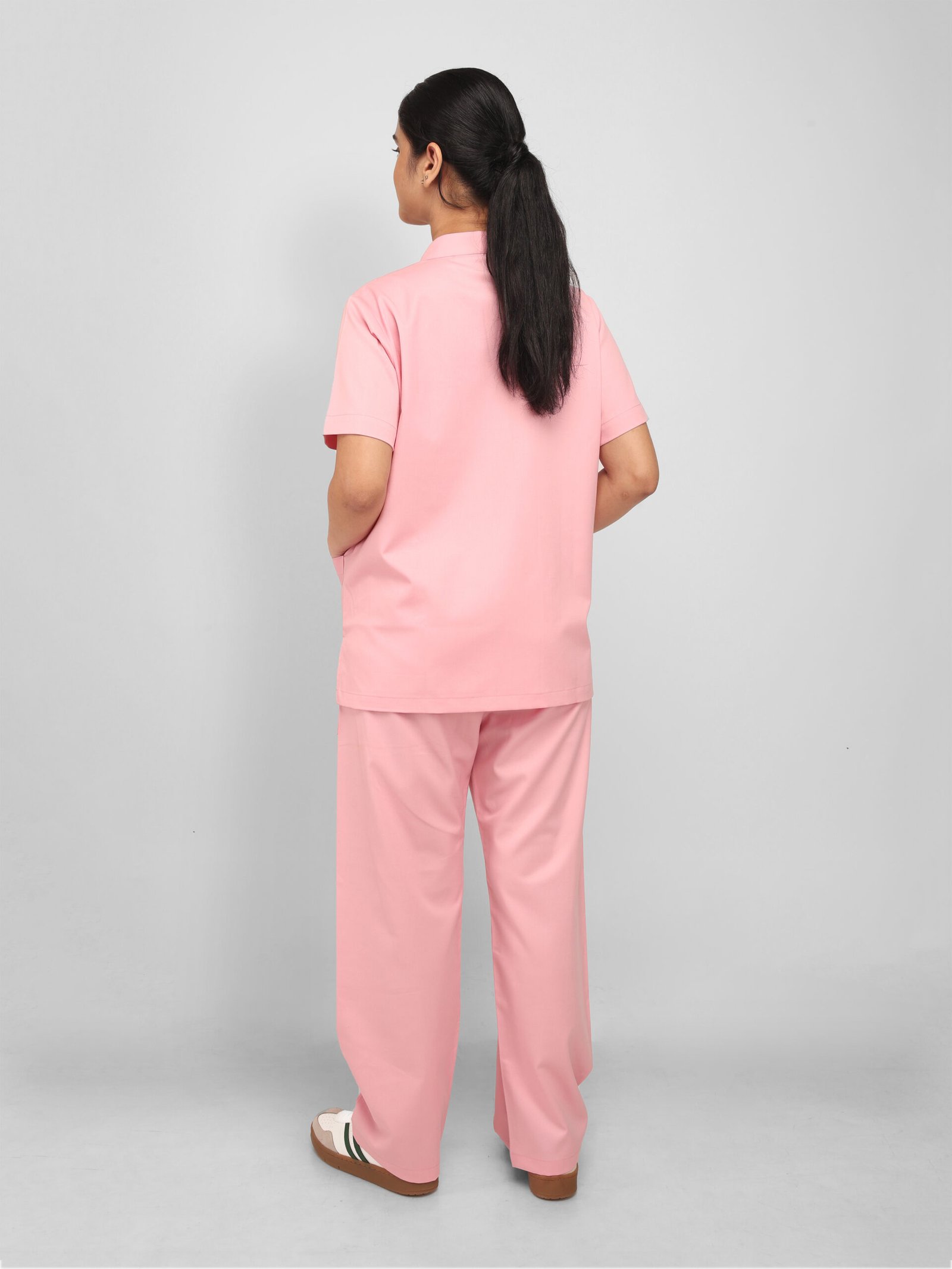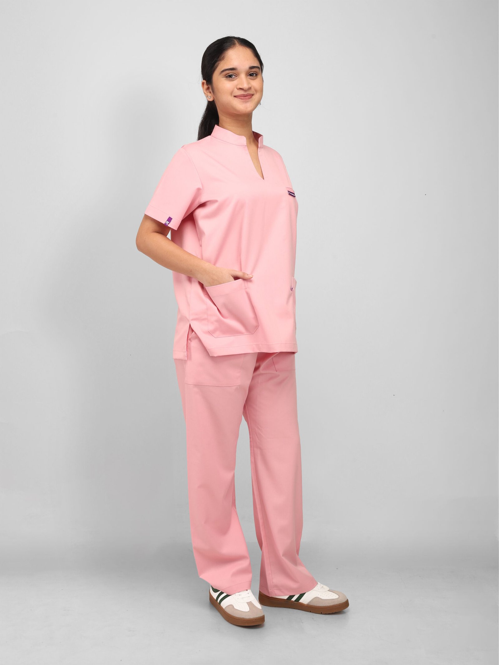 This pink scrub set brings style and comfort to the workplace for modern medical professionals. Designed with a chic mandarin collar and subtle slit, short sleeves for easy movement, and five practical pockets for everyday essentials, it combines functionality with a polished look—proving that doctors can be stylish at work too.