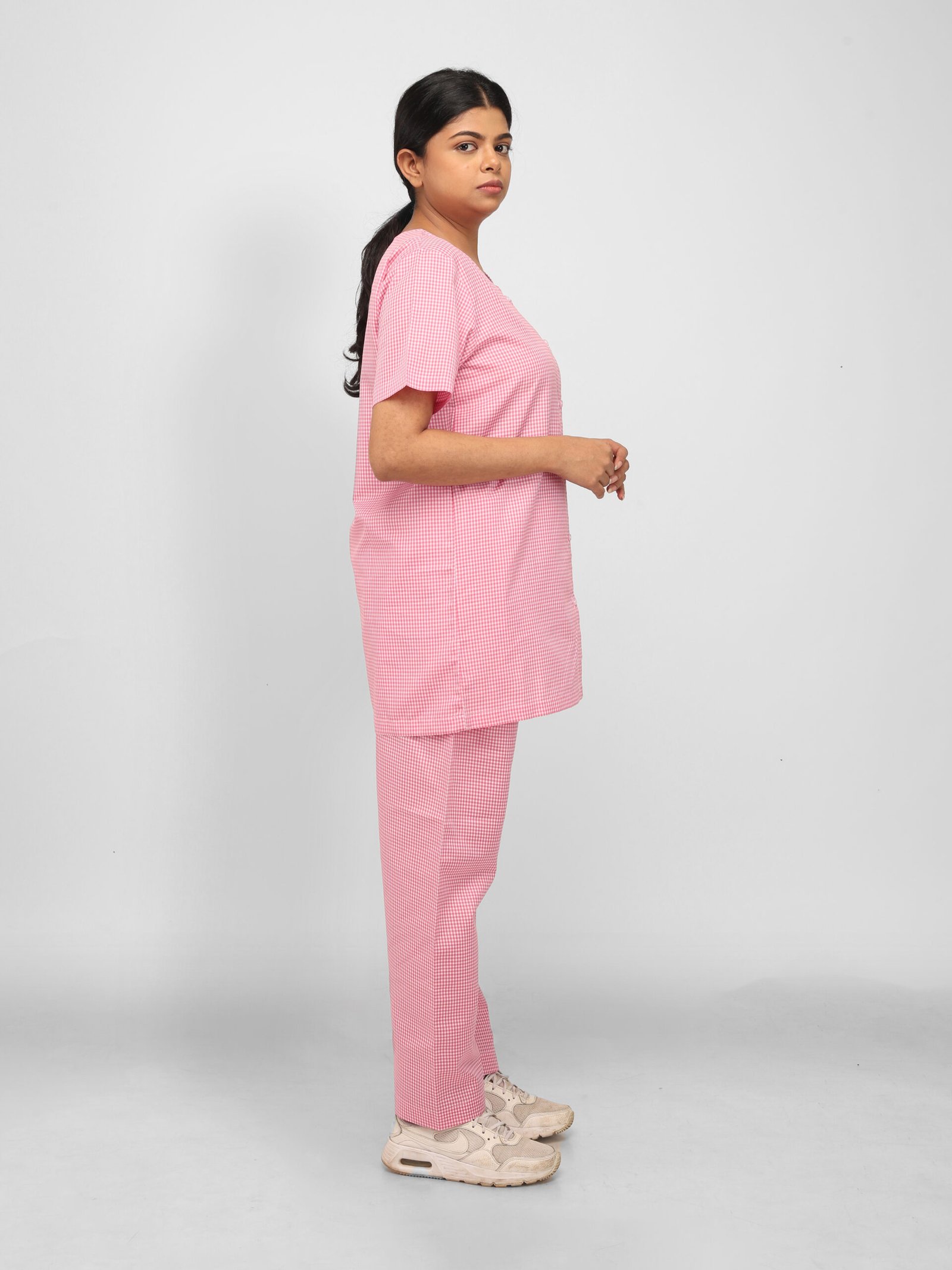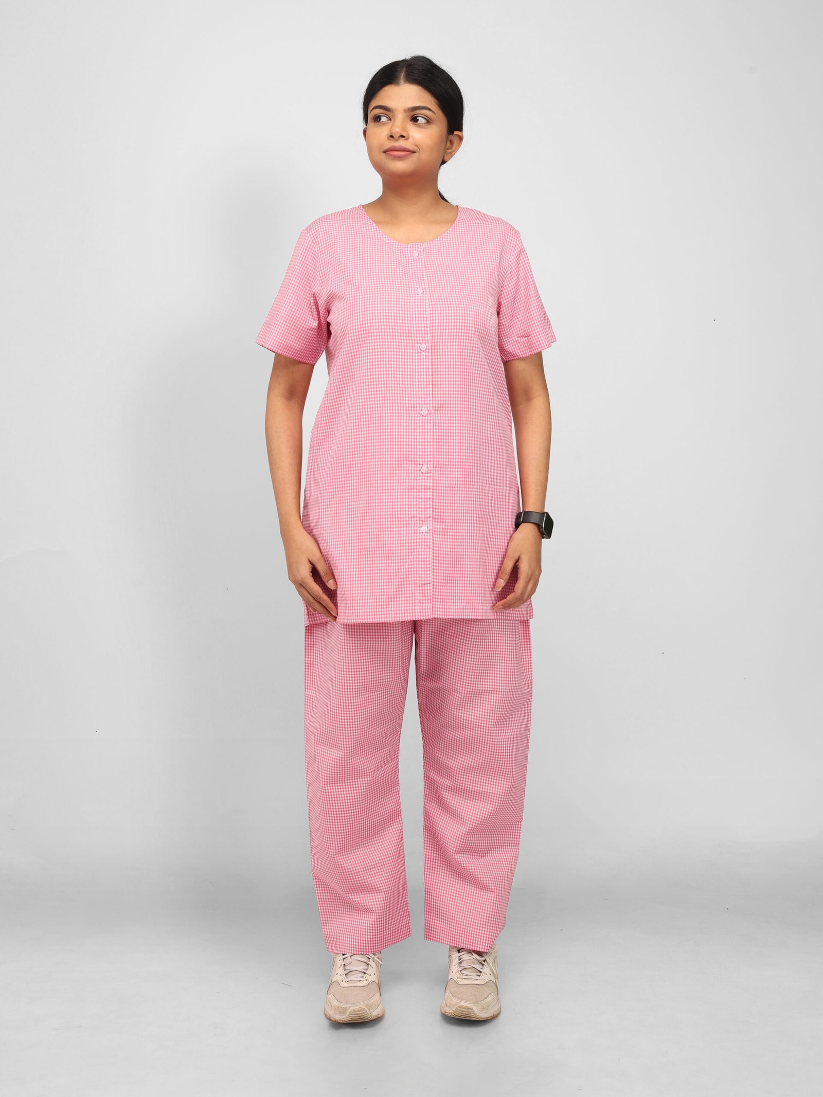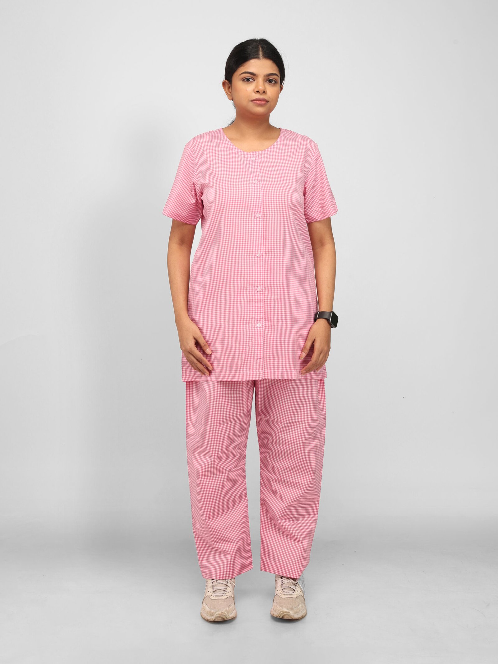 This female patient dress is made from soft, breathable pure cotton fabric, providing exceptional comfort for all-day wear. In a soothing pink hue, it features a relaxed round-neck design with short sleeves for ease of movement and convenience. The lightweight fabric and loose fit ensure maximum comfort, making it an ideal choice for hospital stays, recovery periods, and general medical care settings.